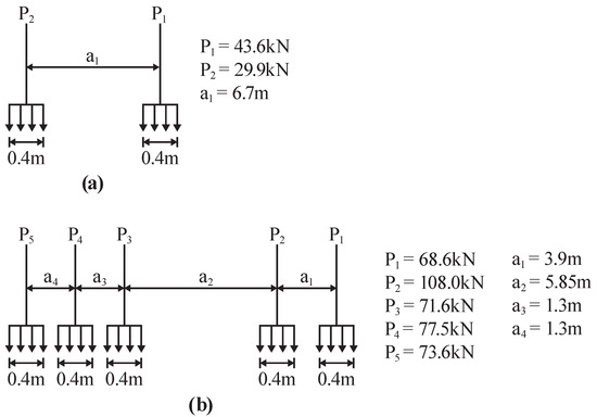 Sketch showing details of the vehicle loads used in the simulations for (a) two-axle vehicle and (b) five-axle vehicle.