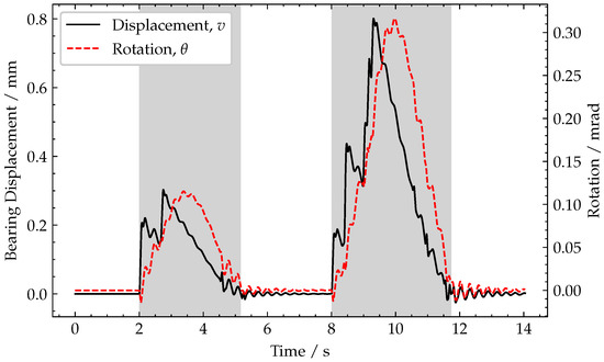 Plot of end of span rotation and end of span vertical (bearing) displacement. Periods when a vehicle is crossing the bridge are shaded grey.