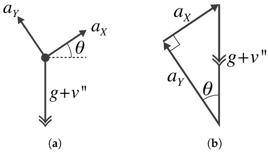 Sketches of (a) free-body diagram showing the apparent rotation of the Earth’s gravity (g) and vertical bridge acceleration () components; (b) equivalent vector diagram showing the x- and y-axis acceleration components.