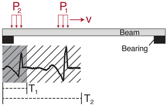 The generalised variance is computed over a sliding rectangular window of length, , to detect the increase in generalised variance during vehicle crossing events. This method exploits the impact loading as each axle enters the bridge (see the relatively large spikes observed when vehicles’ axles enter the bridge in Figure 6d). As the vehicle leaves the bridge, a similar effect occurs, but this time arising from the sudden unloading of the beam and bearing as each axle leaves the bridge. In Figure 7, the impulses for two axles (modelled as patch loads), and , moving at constant velocity, v, are shown. Therefore, a sliding window of temporal length, , contains the signal related to a spatial length, , travelled by the moving loads. This allows the choice of sliding window length, , to be made based on the vehicle speed limit of the road crossing the bridge and the typical vehicle geometries encountered. As axle spacings are typically no less than , setting would allow the full patch load to be captured but not multiple axles, as illustrated by in Figure 7.