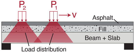 However, in reality this approach of setting to capture individual axles may be problematic for bridges with a larger deck thicknesses, as the load will distribute through the structure. This may be due to a number of factors including: beam depth, slab thickness, presence of fill or asphalt thickness. This is illustrated in Figure 8, where it can be seen that the applied load at the asphalt surface is distributed both vertically and horizontally through the layers of the deck. Unless the axles are sufficiently far enough apart, given the effect of load distribution, a shorter window will likely capture groups of axles and not individual axles. Therefore, a longer window (shown as in Figure 7) intended to capture a full vehicle may be employed. As the shortest European lorry wheelbases are approximately 4 , and the longest are around , a reasonable sliding window length to capture full vehicles is found by setting in the range of 8 to 10 long. If a longer window was employed the detector may struggle to distinguish two vehicles with a short headway versus one longer vehicle.