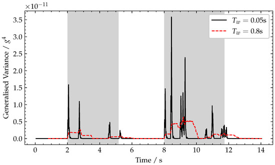 Plot of generalised variance for varying window lengths, . Periods when a vehicle is crossing the bridge are shaded grey.