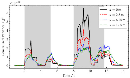 To demonstrate the effect of varying sensor location, the simulated accelerometer is placed at (a) directly over the support, , (b) close to the end of span, , (c) quarter-span, , and (d) mid-span, . The results of these simulations are shown in Figure 10, from which it can been noted that, at all sensor locations, the generalised variance has approximately the same profile, but this is larger closer to the end of the spans, where the peak rotation values are observed.