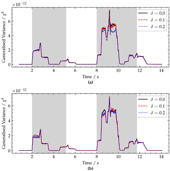 Plot of generalised variance for varying damage severity, , with the damage located at (a) mid-span and (b) quarter-span. Periods when a vehicle is crossing the bridge are shaded grey.
