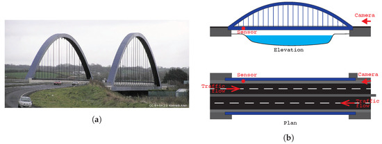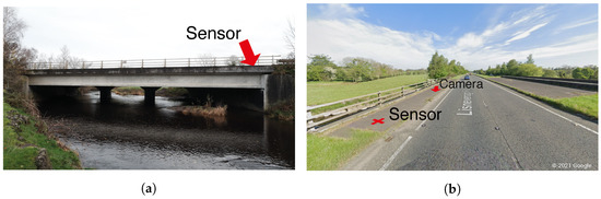 Photographs of (a) West elevation of bridge and (b) Northbound approach to bridge showing sensor and camera locations.