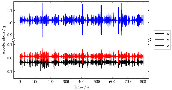 In Figure 13, the raw acceleration signals recorded during an 800 test window are plotted on a broken axis to maintain the observed biases. As the test was carried out during a relative busy period, although still with free-flow traffic, the raw acceleration time series contains a large number of transient signals, corresponding to vehicles crossing the bridge. However, the majority of these transient signals are approximately the same magnitude and thus are not very helpful to directly separate vehicle loading by some simple thresholding on the raw acceleration signals.