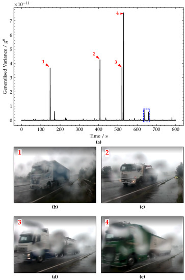 (a) Plot of generalised variance signal. (b–e) Pictures of vehicles corresponding to peaks 1–4, respectively.