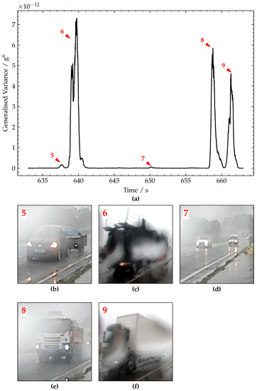 (a) Plot of generalised variance signal. (b–f) Pictures of vehicles corresponding to peaks annotated 5–9, respectively.