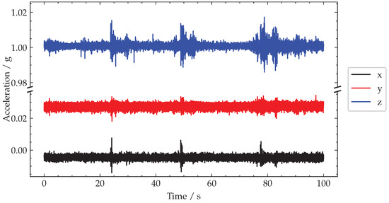 In Figure 18, the raw acceleration signals recorded during a 100 test window are plotted on a broken axis to maintain the observed biases. A sliding window of was used based on a spatial length to observe and the traffic velocity, .