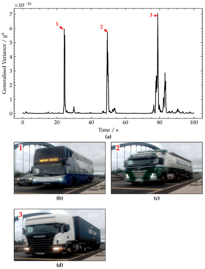 The generalised variance signal is shown in Figure 19a. From this plot, three distinct peaks are apparent, labelled 1–3 for convenience with the frame grabs from the corresponding video footage shown in Figure 19b–d. These peaks 1–3 were caused by heavy vehicle crossings, specifically: a three-axle double-decker bus, a six-axle bulk feed lorry and a five-axle container lorry. The approximate magnitudes of these major peaks are 5.9 × 10−16 g6, 5.7 × 10−16 g6 and 6.9 × 10−16 g6, respectively. Each crossing appears as a pair of peaks, corresponding to vehicle entering and exiting the bridge, respectively.