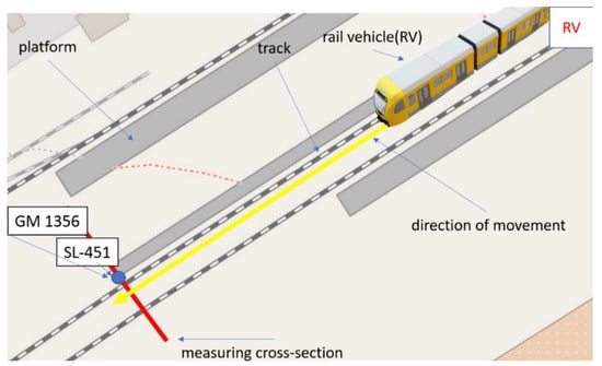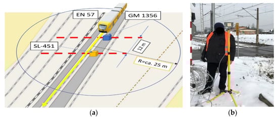 The idea of the proposed methodology is to measure the acoustic waveform at a certain distance from the moving rail vehicle. The purpose of the measurement is to test the possibility of identifying the position (or/and velocity) of the rail vehicle in the railway network and to assess the functionality of the presented methodology. The greatest distance from the location of the sound meter to rail vehicle position is desired: “the bigger, the better”.