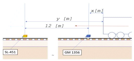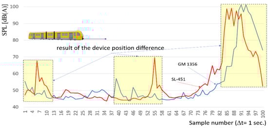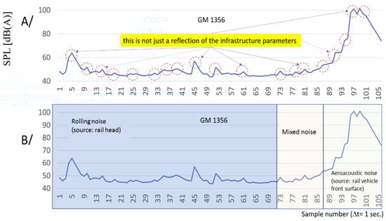 Figure 2b). The use of such a train positioning system (microwave radar and GPS) enables the calibration of the obtained results. Such control of the obtained data is possible in the range from 50 to 700 m for medium range radar and much larger range with less accuracy for GPS. Susceptible elements, especially in rail connection area, generate local changes in the signal. The sound level meter, placed in a location susceptible to deformation of GM 1356, shows significant differences in the values of the measured characteristics in relation to a sound level meter located halfway along the length of the rail. Thus, probably a better recommendation is to locate the sound level meter at half the length of the rail. Hence, it can be hypothesized that both of the analyzed microphones locations have different functionalities for detecting the position of a rail vehicle or ruptures of the rail.