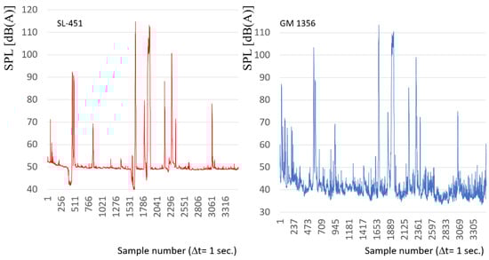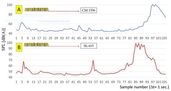 Figure 13 presents an example of the results register for passing two trains (one by one, one queue). The first is the EN71 passenger train and the second EU3100 freight train. The differences in sound level distribution for the maximum range are significant.