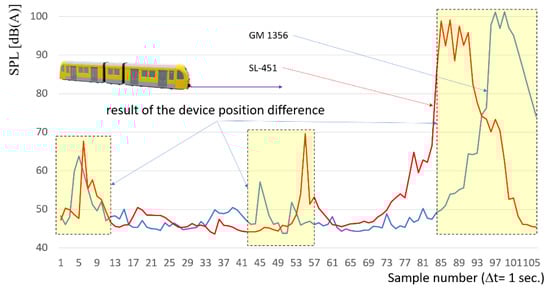 During the research, the sound pressure levels were recorded each with a 125 m/s logger step. The average values were calculated over an interval of 1 second. The passage of the EN 57 passenger compartment operating on a regular passenger line was examined (filled rail vehicle). The distance between device GM 1356 and SL 451 is calculated in the direction of travel of the EN 57 rail vehicle. During the test in a radius of approx. 25 m from the middle of the distance between sound level meters, no devices and objects generating different noise were recorded (early morning, calm hours) (