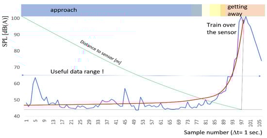 The rail vehicle approaching the microphone area, from the moment the signal is detected until the sensor passes, generates a sound pressure level similar to the exponential distribution (red line in
