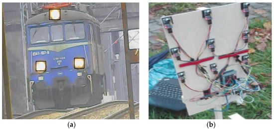 Figure 8a). The figure shows the detection of characteristic objects of a rail vehicle from a long distance (approximately 1000 m).