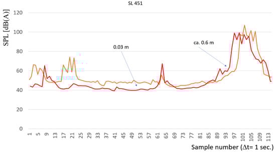 The comparison of the sound level distribution without time or shift correction as a result of distance between these two sound level meters is presented in