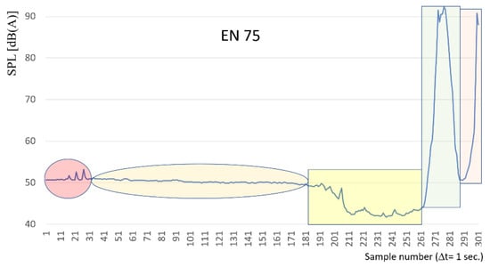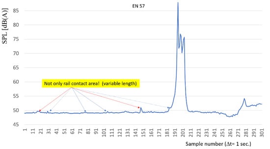 Figure 7, a significant increase in the level of sound pressure levels takes place during ca. 7 s, until the place where the sound level meter is located at the speed of the rail vehicle about 10 km/h. This means that the increase in the sound level value allows for detection of trains at distances depending on their speed (also mass) presented in