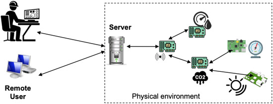 The approach is exemplified on an IoT application system comprising a server (that could also be a reduced set of servers) that are connected to the operational physical network of IoT devices, and to a data base that stores the logs about the environment situation. Operators interact with the server to retrieve information about the facility and its associated variables (e.g., temperature, humidity, pressure, etc.); and to set the values of these actuation devices when needed. Figure 1 shows the target domain.