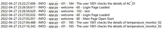 The log functions of Python are used to record the operations in a log that can be later checked for security forensics. This is used at the start of each server function that handled a route, app.logger.info("Log text"). The log text informs about the operation that is performed, e.g., Operator + user + checks info of + device_id. In addition, the function logging.FileHandler(’test.log’, encoding=’UTF-8’) is used to store all the logs to a particular file (as shown it is file test.log at the server). Figure 5 shows a screenshot of how the log file looks like.