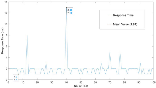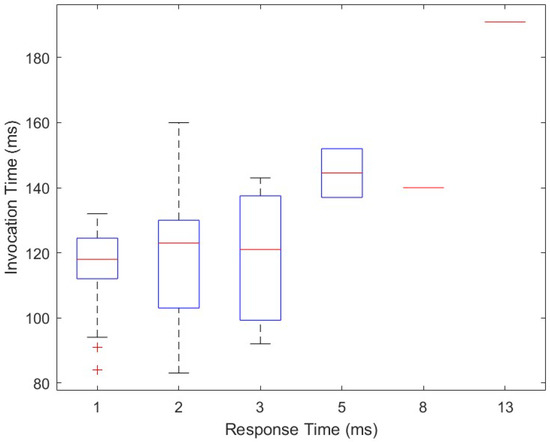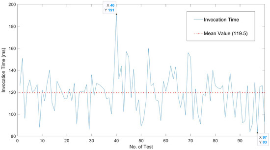The temporal behavior of our solution is expanded in Figure 8. Figure 8 shows the behavior of our proposed solution when tested to extract the execution times of the whole interaction process between users and server. Ten measures are reported for each experiment. Figure 9 shows the overall invocation time costs in relation to the response times in the extensive testing performed for our solution. The temporal behavior is summarized in Table 2, such that the average interaction time is around 120 ms, with a sustained behavior and a few peaks of 150 ms. The cost of the overall process of request and vulnerability check is low. The overhead of the tests and of the usage of the timing APIs is appropriate to provide a near real-time interaction.