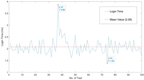 Figure 6 shows the response time of the server in terms of request reception and test execution. Times are measured by taking as base points the loadEventStart and fetchStart of [34]. Obtaining the time in Selenium is done with driver.find_element. A log is created to gather one hundred interactions of ten repetitions each, so that each point that is shown is the average of n measures. Figure 7 shows the cost of the server functions involved in the login operation.