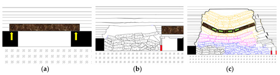 Structure evolution process of mining overburden. (a) Fixed beam structure; (b) cantilever beam structure; (c) masonry beam structure.