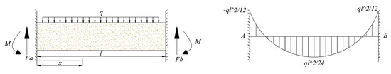 As shown in Figure 2, in the initial mining stage, the basic roof forms a two-end fixed beam structure, the front and rear coal walls are beam supports, and the load of overlying strata is equivalent to the uniformly distributed load “q”, which can be calculated according to the following equation: