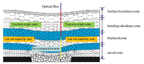 As shown in Figure 3, when the fiber is in the mined-out area, the stress state in different areas is significantly different. The red part is located in the bending subsidence zone. The typical characteristics of this area are that the rock mass structure is complete, macro cracks are not developed, and the coupling contact relationship between the fiber and rock mass is positive. The green part is the separation zone formed under the key stratum. The optical fiber is separated from the rock mass in the area, and the measured data cannot reflect the real deformation of the rock mass. The yellow area is in the fracture zone and caved zone, the rock mass stress reaches the strength limit and then fractures, and there is friction and squeezing force between the broken rock block and the optical fiber. Therefore, the vertical zoning characteristics of the overburden can be inversed by analyzing the coupling contact relationship between the optical fiber and rock mass in different zoning areas.
