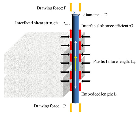 where D, l, E and A are the diameter, embedded length, elastic modulus and cross-sectional area of the optical cable, respectively; G is the shear coefficient of the fiber–rock interface; τMax is the shear strength of the interface; LP is the plastic failure length in the process of interface failure. The corresponding strain expression of each stage is as follows: