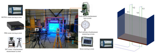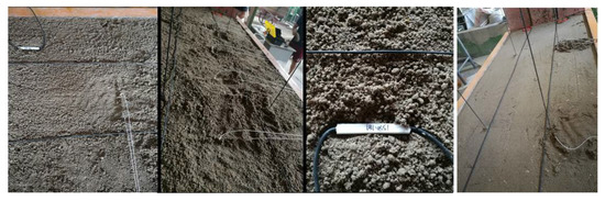 Considering the simulated rock formation thickness and the geometric size of the laboratory model frame, the geometric size of the model is 1500 (length) × 600 (width) × 1300 (height) mm. The geometric similarity ratio is 1:150, the thickness of the overlying strata is 1.28 m when the thickness of the model coal seam is 5 cm, which meets the height limit of the model frame, and it can be simulated to the ground surface loose layer without external load replenishment [33]. According to the requirements of similarity and previous research experience, it is determined that sand, pulverized coal, clay and mica (also as layered materials) are used as aggregates in each rock layer. Gypsum and lime powder are used as cementitious material and water as solvent material. The measurement methods used in this physical similarity model test include distributed optical fiber strain measurement system (BOTDA) and FBG. A total of four vertical optical fibers are arranged, named V1\V2\V3\V4, as shown in Figure 8. The sensing optical fiber needs to determine the specific position coordinates of each optical fiber in the model through spatial positioning [34]. The distributed optical fiber monitoring demodulation equipment is “NBX-6055”.