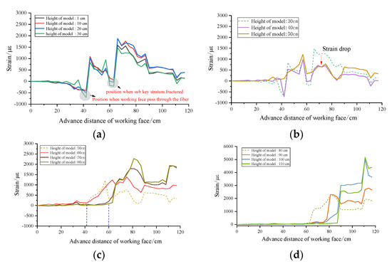 In order to obtain the variation law of the strain in a different height, the data collected from the physical model test are analyzed. The total height of the model is 129 cm. Starting from the bottom plate, the monitoring points are taken from the bottom to the top of the model at an interval of 10 cm. The strain distribution of each measuring point with the advance of the working face is shown in Figure 9. The data of strain curves with similar variation trend are put in the same graph, and the dotted line is used as the reference for the obvious change of strain, which shows that the trend of the strain curve will change significantly when breaking through a certain height.