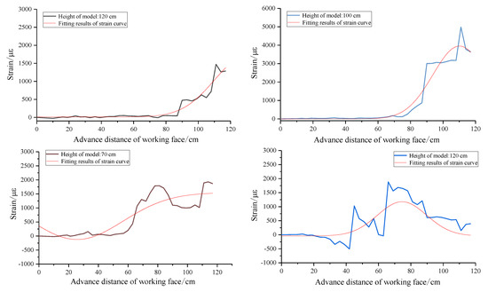 The results show that the strain curve in the height of 40–50 cm has a great change compared with that before; in particular, the strain value decreases substantially after the working face advances to 60 cm. The development trend of the curve in the range of 60–80 cm height is basically the same; compared with the height of 50 cm, the position where the strain increases significantly from zero is changed from the working face advancing to 45–60 cm. The development trend of the curve in the range of 90–110 cm height is basically the same; the position where the strain increases significantly from zero is changed from the working face advancing to 66–90 cm. The development trend of the curve in the range of 120–129 cm height is basically the same, the strain value is far less than that under it, and the strain at the top of the model is almost zero.