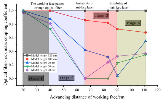 From Figure 11, the whole process of the working face advance can be divided into four typical characteristic stages. The coupling coefficient decreases obviously for the first time when the working face passes through the optical fiber; the second significant change point is that after the first instability of the sub key stratum. The coupling coefficient decreases to 0–0.4, the fracture of the sub key stratum causes the large-scale movement and failure of the overlying strata, and the optical fiber separates from the rock mass in some areas. The third significant change point occurs after the first instability of the main key stratum. It can be seen that the coupling coefficient of 70 cm height decreases from 0.6 to 0.4, and the coupling coefficient of the lower failure zone increases obviously. This is mainly due to the failure and instability of the key stratum, which causes the strong compaction of the damaged area in the mined-out area, which leads to the increase in the coupling coefficient in the lower part of the mined-out area. The results show that the response of the optical fiber sensing of rock mass deformation is mainly affected by the relative position of the working face and optical fiber and the instability of the key stratum.