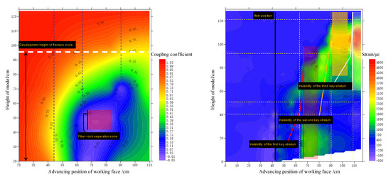 At the height of 120 cm, the coupling coefficient of the whole advancing process is always kept at 1, which indicates that the area is almost unaffected by mining, the rock structure is intact and keeps close contact with optical fiber, and the strain measured by the optical fiber is the real strain of the rock mass. The rock mass in the height of 100 cm is above the main key stratum, and the coupling coefficient continually decreases slowly under the protection of the main key stratum. Through the above-mentioned interface mechanical analysis, it can be seen that the coupling relationship of fiber–rock is always synchronous, coupled and compatible. The coupling coefficient suddenly drops to less than 0.5 at the height of 70 cm and under it when the working face advances to 66 cm. From the above analysis, it can be seen that the first instability and fracture occur in the sub key stratum. At the height of 50 cm, the rock mass is completely separated from the optical fiber in the large abscission layer empty space, and the coupling coefficient is 0. The mined-out area is gradually compacted as the working face continues to advance, and the coupling coefficient picks up gradually.