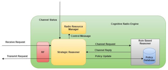 To govern network resource behavior, a computer or process must be capable of consuming and applying machine-readable rules. The computer/process is referred to as the policy engine, as in Figure 1. For events requiring changes to the configuration of a resource, the policy engine is responsible for providing a response. Configuration directives or authorizations tailored to specific network devices are often the results of the policy engine. The policy engine as shown in Figure 1 connects domain-specific goals with the capabilities of the devices they are associated with [14]. In spite of the fact that policy engines must interact with particular vendor devices, they have been seen as general-purpose instruments susceptible to logical thinking through rules. Strategic reasoner (SR) and rule-based reasoner (RBR), the policy engines for cognitive radio, work together to determine if spectrum access options are available that are compatible with the currently active set of regulatory requirements. The SR sends a channel request to the RBR with a transmission plan it has developed based on the behavior data it has collected from the channel’s primary users and its present state [15,16]. For the purpose of making sure the allocation plan is in compliance with the rules, the RBR compares channel requests to those policies. The RBR provides a denial-of-service response to the SR if it detects that a portion of configuration states in the channel request is erroneous. Constraints for opportunistic access are the adjusted parameters derived by the RBR. The basic reasoning challenge in policy-enabled cognitive radio is to determine whether a channel request should be processed or refused based on a given set of rules and allocation techniques, and, if denied, to calculate the limitations for opportunistic access to the channel.