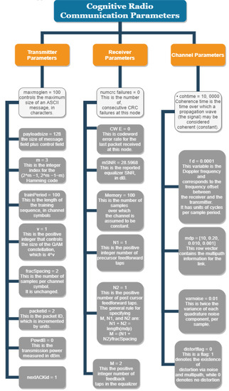 Figure 2 and Table 2 summarize the set of exhaustive cognitive radio parameters for transmitters, receivers, and channels. The parameters [19,20] are considered by the swotting algorithm which is mentioned in Algorithm 1, for doing parameter mapping before channels are mapped.