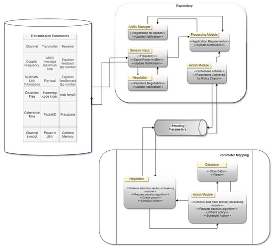 Assisting the cognitive network, the PMR accepts sensory input from the communication layer, selects suitable channels [24,25], and fine-tunes transmission parameters to enhance the cognitive network’s performance for each generic interface; the PMR is responsible for storing and processing sensory data that has been sent to it as in Figure 3. In addition, it prepares and sends various transmission parameter setting options through the corresponding interfaces along the stack levels. The parameter mapper is responsible for making the final choice of temporary data storage repository for parameter mapper modules’ data flow. Following are the modules that make up the parameter mapper framework.
