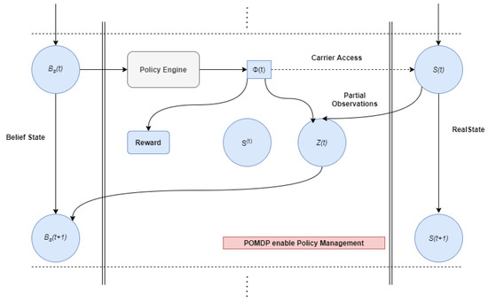 No states can be observed directly inside the POMDP infrastructure as in Figure 4; the collection of observations Z(t) ∈ Z is required to render the representation of the physical state. Then, observations are assumed with probabilistic behavior in which the observation function O is depicted as a probability distribution across the feasible observations Z(t), in action Φ(t), and final states S(t), which is represented by [27],