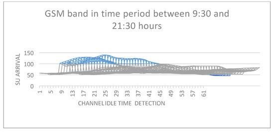 The data are analyzed in Figure 6 and Figure 7 using several sample windows, each with 1024 discrete points. To reduce overlap between subsequent observation vectors, a block of 512 points was eliminated between each pair. The resolution bandwidth for each window is of value 10 MHz and is balanced on 942 MHZ, resulting in 9.7 kHz guard space between each pair of points captured every 10 μs. Parallel to our allocation method, we did an analytical investigation utilizing the open-source project “bit-gsm”, which allowed us to get an a priori understanding of the occupied PU considered territory.