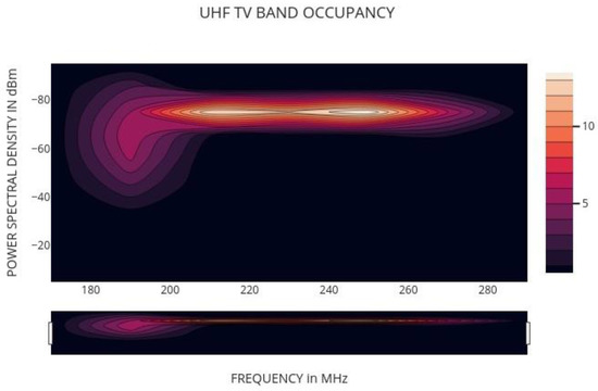 Using a resolution of 30 kHz, the spectrum analyzer was able to identify fixed voltages as in Figure 9. Three 90 MHz segments with 3001 continuous channels were used to measure the whole spectrum from DC to 300 MHz. Typical VHF low-end broadcasts often have a bandwidth of 30 kHz, which is wider than 30 kHz. The result for the 180–270 MHz frequency range is shown in the graph below. There is a clear depiction of broadcast television channel 10 in this image (193.25 MHz, 196.83 MHz, and 197.75 MHz). There is a strong correlation between the mean and maximum PSDs, which indicates that the channels that are most often utilized have a high frequency. Following that, we make an effort to quantify spectral occupancy. Notably, huge sections of the spectrum are virtually always occupied by extremely powerful, very broadband transmissions—particularly, broadcast television and FM stations [34]. Clearly, incorporating such sections of the spectrum in computations of spectral occupancy is of little use.