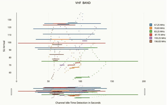It should be emphasized that the spectrum occupancy in the observations presented here is actually sparse. There is virtually little indication of sustained activity greater than 87 dBm per 30 kHz. For a rural environment, the frequency sample size taken is 25–90 MHz. PSD value of 100 dBm is a good sample. Frequency-agile operation in the metropolitan area may be accomplished by using 31 to 60 MHz and 141 to 180 MHz as feasible possibilities. These bands had 40 and 67 openings with bandwidths ranging from 29 kHz to more than 2.9 MHz. This band’s statistics may be affected by improvements in measurement sensitivity, which is expected. Furthermore, it should be remembered that broadcast television stations operating on many channels may be dominant in particular locations. Nonetheless, these are generally favorable results for the future of cognitive radio with frequency agility. The measurements provided are imperfect, and further effort will be required to provide a credible verdict. Next generation measurements should focus on long-term (weeks) observation at several sites with a time-frequency resolution of 1kHz in 1 msec. An evaluation of the feasibility and expected capacity of cognitive radio networks operating in the unallocated spectrum without interfering with major users must meet these severe conditions [35].