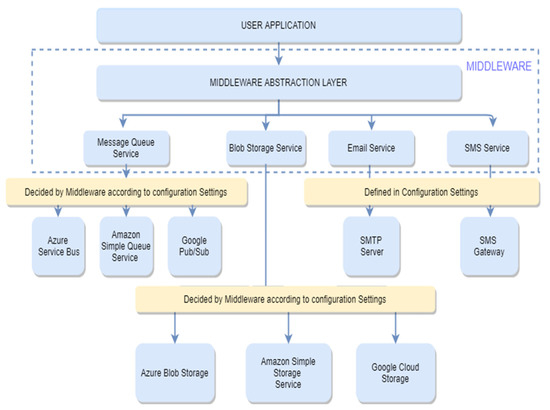 The cloud computing paradigm has revolutionized the IT world with inherent advantages like scalability and cost savings. However, a few issues such as security and vendor lock-in, hinder its growth. The lack of interoperability and portability is the sole reason for vendor lock-in [1]. The platform-as-a-service (PaaS) layer constitutes the middle layer of the cloud computing stack, with the infrastructure-as-a-service (IaaS) layer being the bottom layer and the software-as-a-service (SaaS) layer the topmost layer. PaaS is the layer for software developers who need to use the services for their applications, and the provider is responsible for the infrastructure or the network for the operations. Application portability is the primary concern of the PaaS layer [1,2]. However, an application developed on one PaaS is not easily ported to another PaaS, leading to a situation known as vendor lock-in. The vendor lock-in problem is more prominent in the PaaS layer than in other layers. According to [3,4,5,6,7], the vendor lock-in situation, which is a consequence of the deficiency of interoperability among cloud vendors, refers to a “lack of ability to migrate application components and associated workloads from cloud provider A to cloud provider B.” Therefore, tackling vendor lock-in is very important; otherwise, using clouds can hinder the benefits and savings [1,2]. We propose a middleware class library developed in .NET Core to create an application that uses any of the supported services (message queue service, BLOB service, email service, and SMS) of any cloud (Google Cloud Platform, Amazon Web Services, and Microsoft Azure) and that can be easily ported into another supported cloud without any significant changes to the application source code [4]. A literature review was also conducted to gain insight into the approaches undertaken by researchers and the industry to deal with portability, especially application portability [5]. The solution approaches in the literature include standards, open libraries, common application programming interfaces (APIs), middleware, and model-based strategies. We chose the middleware approach as a solution for vendor lock-in as it is easy and efficient to integrate a middleware class library in new and existing applications.