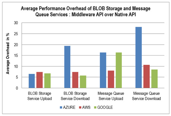 The performance overhead graph (Figure 3) shows the average differences in the times taken in uploading/downloading 100, 500, and 1000 files (1MB each) to/from the BLOB storage and sending/reading 100, 500, and 1000 messages to/from the message queue on all the three clouds using native code versus using our proposed middleware. These average overhead percentages in both the implemented services are minimal except for the Azure cloud’s message queue “download” operation, thus proving that our middleware’s performance is optimal for real-world scenarios. If we consider the fact that the time taken to perform these operations is in milliseconds, then these times taken by the middleware and Azure cloud’s native API are extremely small (67, 43, 5, 9, and 7 milliseconds), and the differences among the values are also minimal. The performance of the middleware is quite close to that of the native API of the cloud. The efficiency of the BLOB storage service dramatically depends on the network stability of the user. The more stable the network is, the more efficient the BLOB storage service will be. For the BLOB storage service, the middleware’s implementation of the Azure cloud performed the best for the “file upload” operation. In contrast, Google Cloud performed with the most negligible overhead for the “file download” process.