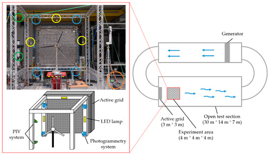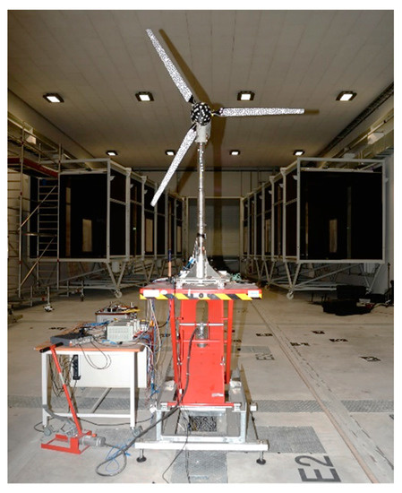 The experiments took place in the Turbulent Wind Tunnel of the University of Oldenburg [56,57]. The wind tunnel is built in the Göttingen design and is shown schematically in Figure 1. The test section has a length of 30 m and a cross-section of 3 m by 3 m. Experiments can take place in the closed as well as in the open test section. Due to the size of the model wind turbine, the open test section is used. For the generation of the wind flow, four 100 kW motors are installed. These generators can provide wind speeds up to 42 m/s (closed test section) or up to 32 m/s (open test section). An active grid characterizes the wind tunnel (see Figure 1), which allows the generation of realistic wind situations. It consists of 80 shafts that can be controlled individually. Each shaft is equipped with numerous diamond-shaped flaps. Thus, even complex turbulent wind situations can be simulated with high repeatability.