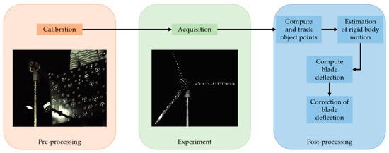 The increasing size and rated capacity of the modern wind turbines, consisting of machines with blade lengths over 100 m and power output of several megawatts [13], makes FSI of great importance. FSI leads to additional loads which can damage the blades and reduce the whole turbine’s performance [14]. To further improve the turbines’ efficiency, safety, and profitability, it is crucial to consider and study this phenomenon. The knowledge gained can be considered in the development of new turbines. A well-known experiment is known as MEXICO [15]. Here, a rotating model wind turbine was used. The stereo Particle Image Velocimetry (PIV) system acquired the aerodynamic phenomena, and load measurement techniques yield the resulting loads. Numerous authors use the collected information for comparison with simulations [16,17]. Furthermore, this experiment is suitable for investigating load-reducing methods [18]. However, the setup is unsuitable for the area-based acquisition of FSI at a rotating model wind turbine.
