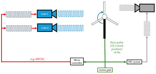 For the analysis of the FSI, synchronization of all measurement systems, namely the active grid and MoWiTO is necessary. The concept of synchronization is illustrated in Figure 5. The protocol of the active grid defines the start trigger (t0). At the start of the experiment, the active grid sends a TTL signal to the measurement systems and the MoWiTO. Due to the configuration of the light sheet of the PIV system, flow data can only be acquired at the 12 o’clock position. Therefore, the data acquisition does not start directly at the t0 signal with the predefined acquisition rate. Instead, both measurement systems start with data acquisition at the first passing of the 12 o’clock position of a rotor blade. Both systems can be used with a different frame rates.