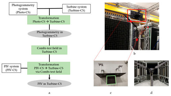 Figure 6a shows the procedure for estimating the transformation parameters. Photo-CS describes the local coordinate system of the photogrammetry system. The origin and orientation of the coordinate system are the same as the exterior orientation of one camera. The calculation of the transformation parameters is based on the points on the nacelle. These points are given in Photo-CS and Turbine-CS. The PIV-CS describes the local coordinate system of the PIV system and is defined by a calibration field (see Figure 6c). However, determining the parameters for the transformation into Turbine-CS is not directly possible. For example, the measurement targets are outside the FOV of the photogrammetry system due to the perpendicular camera configuration. In addition, the depth of field is only a few millimeters large and is aligned with the laser plane. A new test field (Combi-test field) is used to determine the transformation parameters. The Combi-test field consists of the PIV calibration field (green frame) extended by photogrammetric measurement targets (see Figure 6b,c). The PIV calibration field’s object coordinates and measurement targets are determined beforehand by evaluating a closed-loop configuration in the PIV-CS. The targets of the Combi-test field can be determined simultaneously by the photogrammetry system during the PIV system’s calibration process. Afterward, the PIV system can be transformed into the Turbine-CS because the photogrammetry system is already known in the Turbine-CS. All measurement systems are thus available in one global coordinate system.