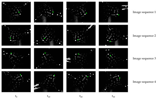 Although the green target is visible in the images of the first and second camera in the first epoch t0, it is hidden in the images of cameras three and four. Due to its rotation, the target position changes in the subsequent epochs (t10–t30). The target “walks” from the field of view of images 1 and 2 into images 3 and 4. Furthermore, the figure shows that the targets are close to each other due to the limited object size, which favors mismatching. Therefore, a new tracking method is used that is robust against temporary occlusions and closely spaced targets.