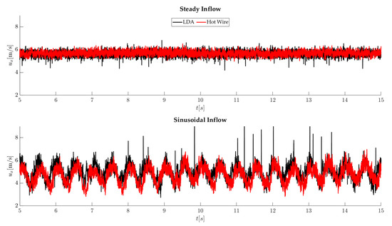 Hot wire and LDA measurements are used to measure the inflow. Two of the used flow types are shown in Figure 8. Both flow types have a duration of 30 s. A constant velocity of 5.6 m/s, a turbulence intensity of 3%, and an integral length scale of 25 cm characterize a steady wind flow. The fluctuations are based primarily on the active grid. This inflow results in a relatively constant load on the rotor blades, where a constant deflection can be expected. The second inflow is called sinusoidal. The characteristic is a sinusoidal behavior with an amplitude of 1 m/s and frequency of 0.5 Hz. This inflow results in an alternating load on the rotor blades, which should also correspond to a sinusoidal profile.